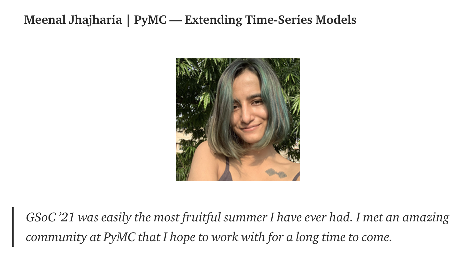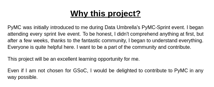 The sprint was initiated by Meenal of the PyMC team (Documentation, Community) in September of 2021. Meenal had recently completed Google Summer of Code, 2021. Her project was entitled PyMC: Extending Time-Series Models.